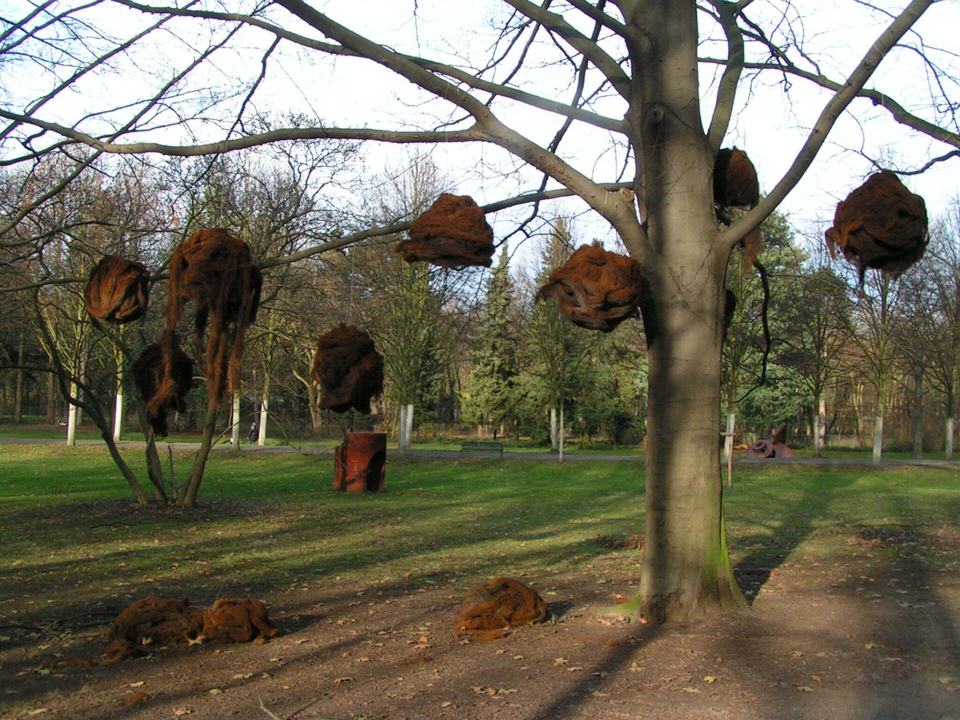 Mittels Stahlwolle lassen sich meiner Erfahrung nach Veränderung und Entwicklung sehr unmittelbar und vielschichtig darstellen. Die farbliche Veränderung des Objektes setzt bereits nach wenigen Tagen ein. Die Intensität und Schnelligkeit der Veränderung werden durch die Witterung und andere äußere Einflüsse bestimmt. Nach einigen Wochen beginnt sich die Form der einzelnen Elemente zu verändern.